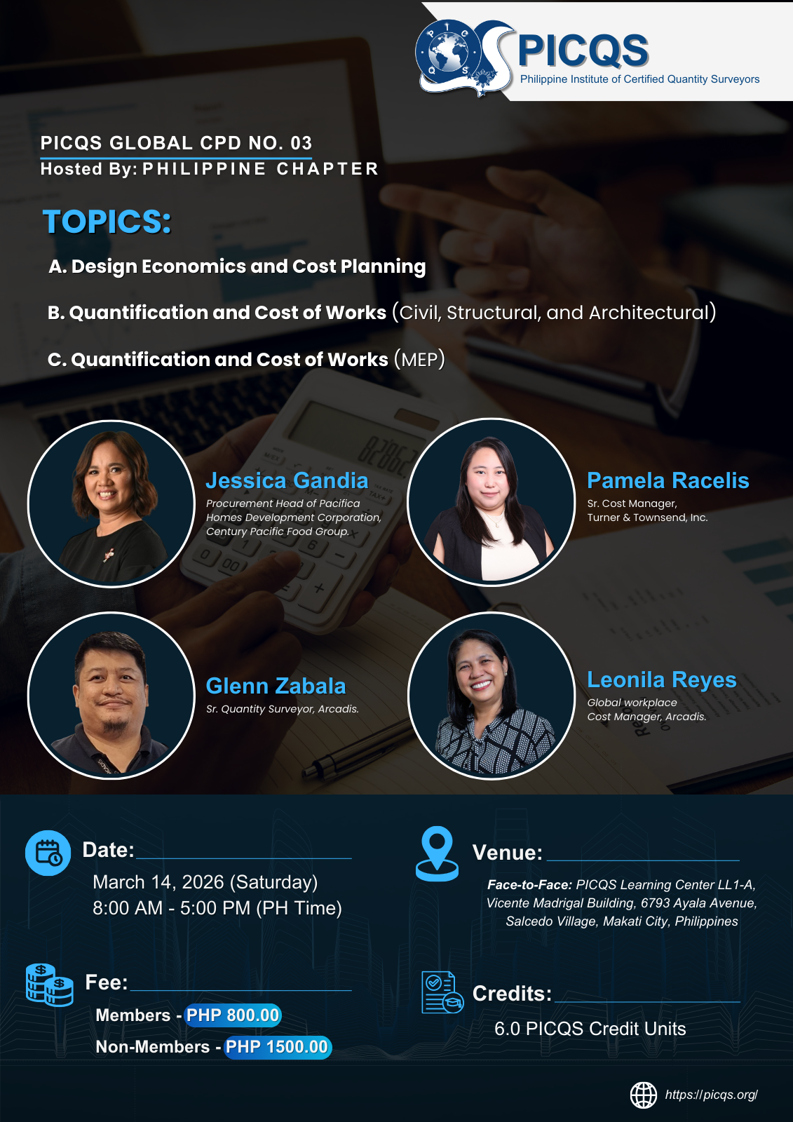 Topic: 2026 PICQS Global CPD No. 03 (F2F Hosted by: PH Chapter): Design Economics and Cost Planning, Quantification and Cost of Works (Civil, Structural and Architectural), Quantification and Cost Works (MEP)